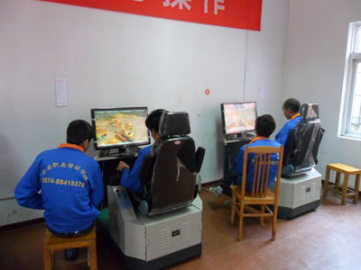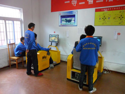 挖掘机学员正在模拟机上学习挖掘机的操作技术 |