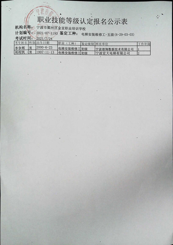 按照《宁波市电梯安全管理办法》和宁波市人社局鉴定中心公开电梯等级认证考试公告规定的程序,把鄞州区人社局鉴定中心审核通过名单进行公示,现公示名单附件: