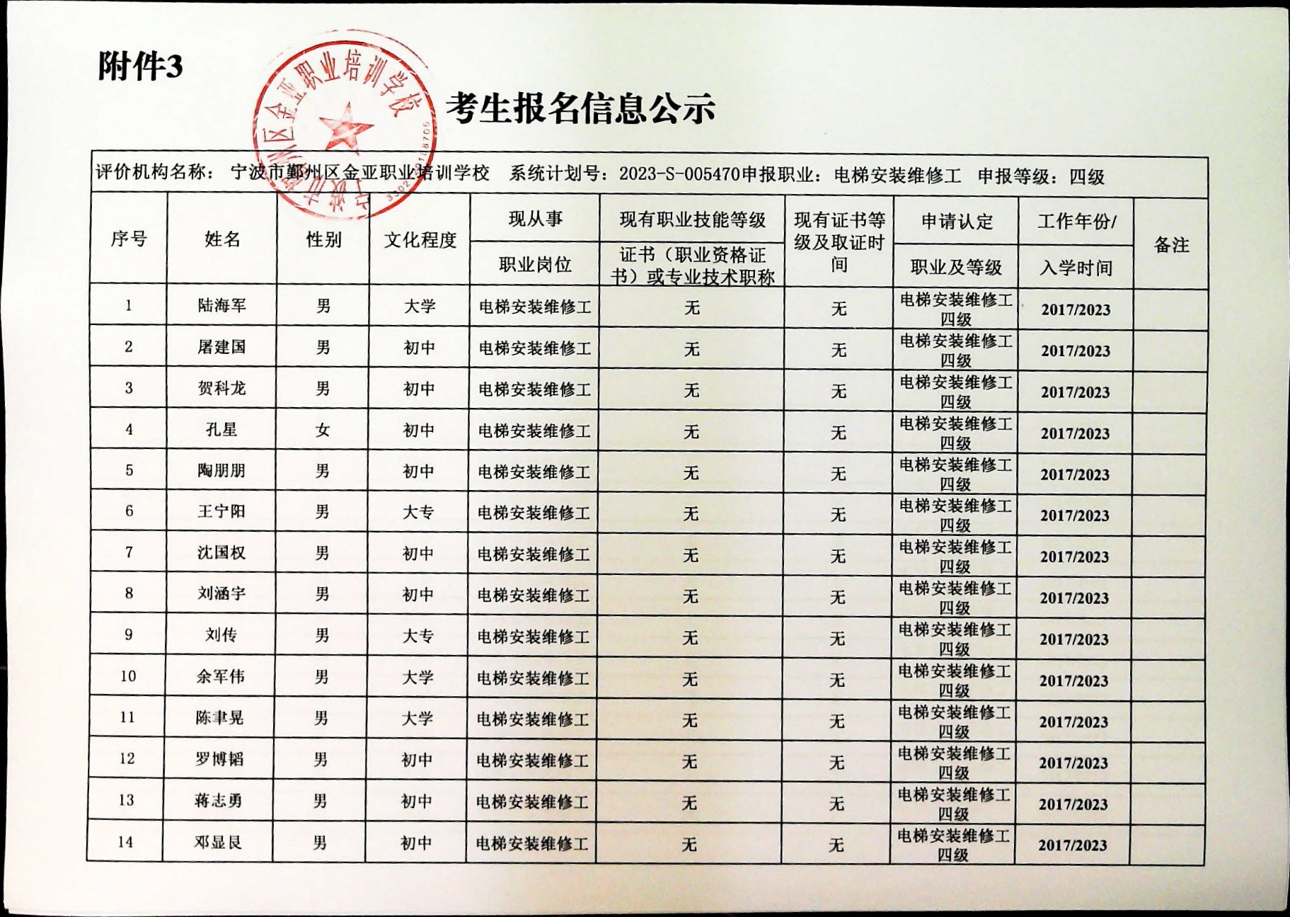 按照宁波市人社局鉴定中心公开电梯安装维修工等级认证考试公告规定的程序,把鄞州区人社局鉴定中心审核通过名单进行公示,现公示名单附件:
