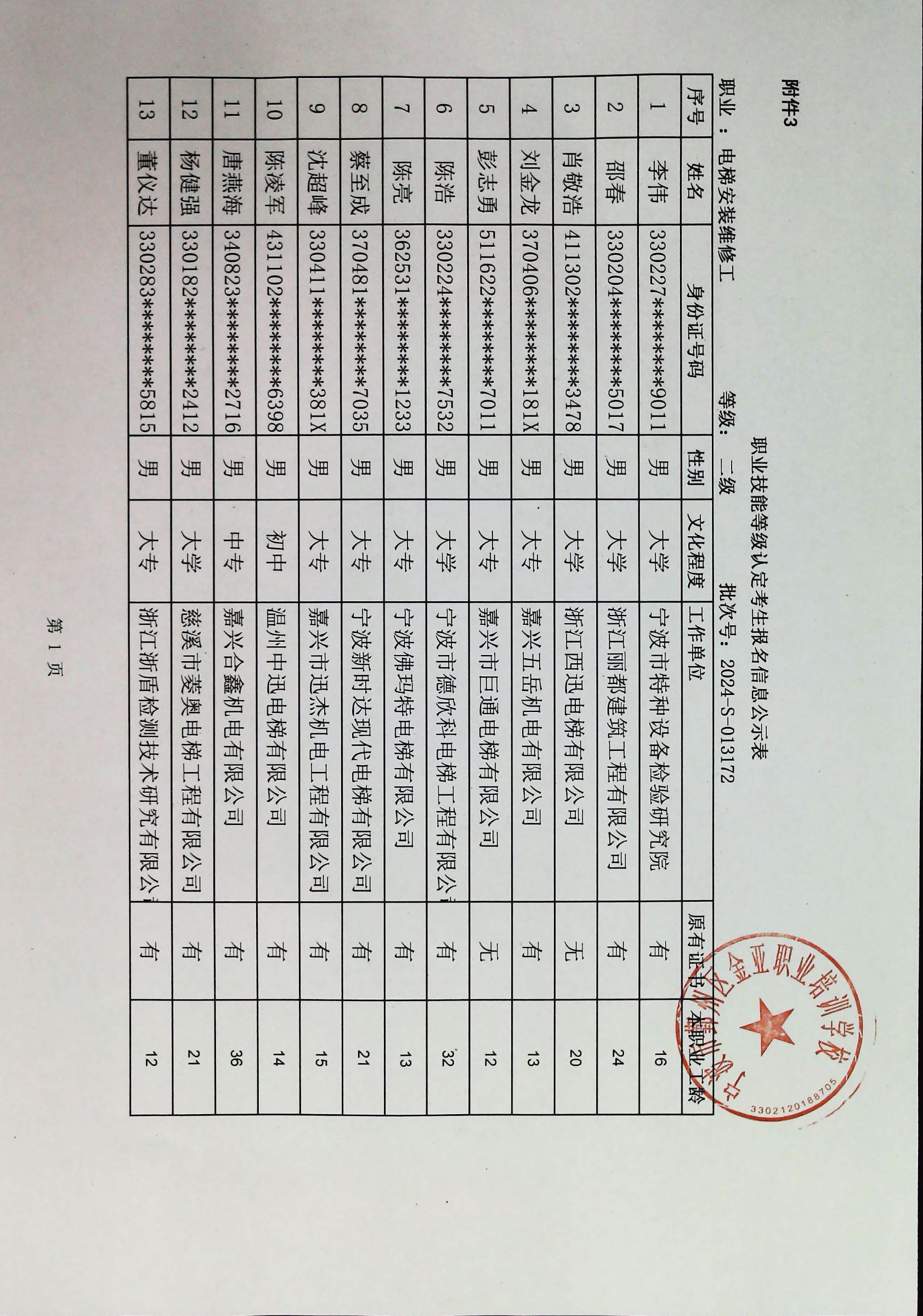 按照宁波市人社局鉴定中心公开电梯安装维修工等级认证考试公告规定的程序,把鄞州区人社局鉴定中心审核通过名单进行公示,现公示名单附件:
