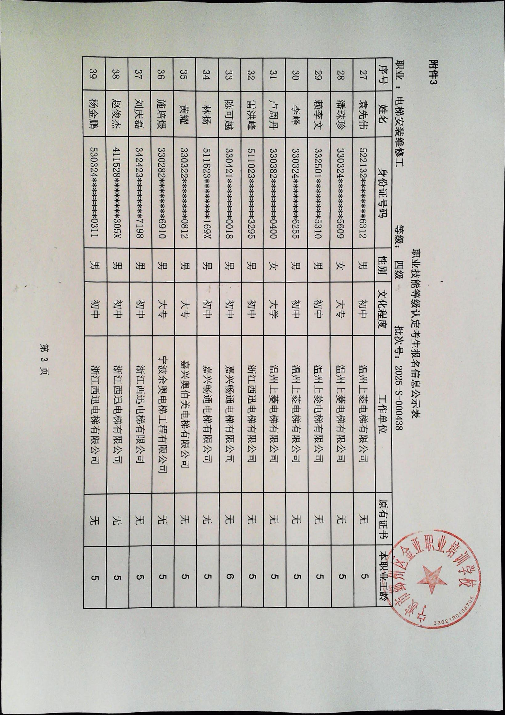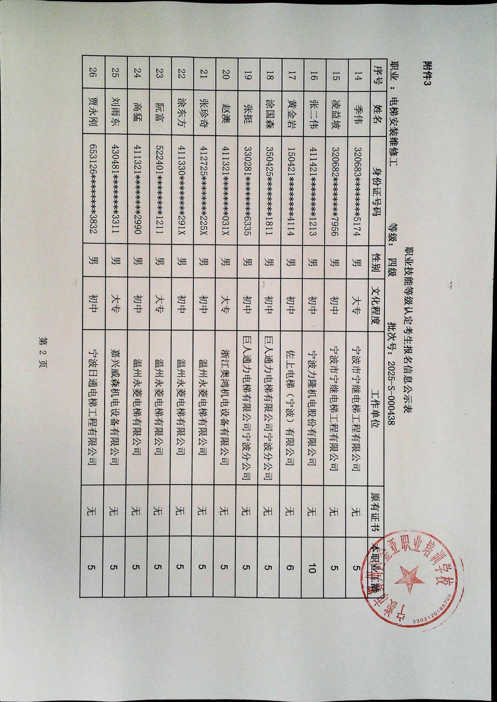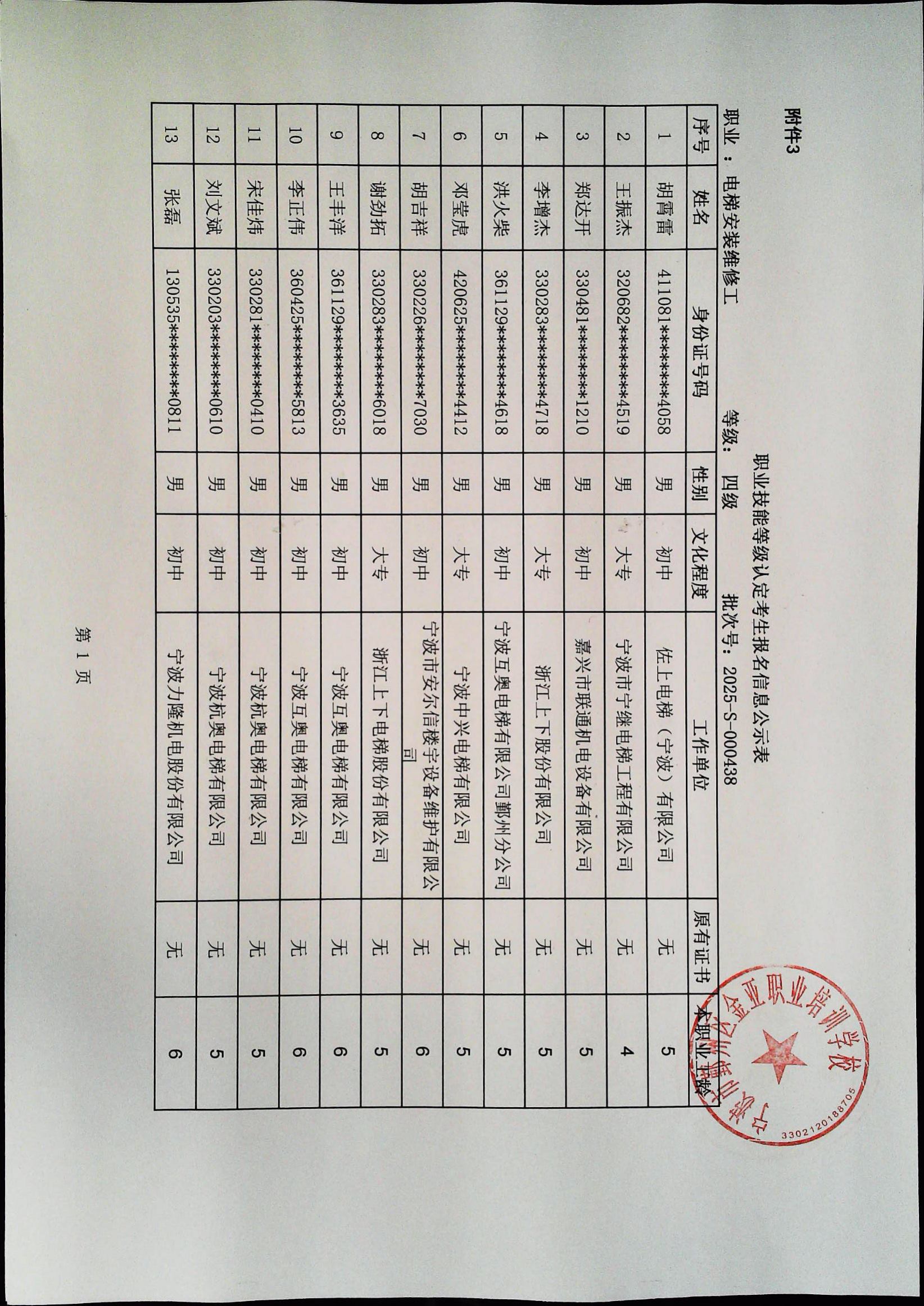 按照宁波市人社局鉴定中心公开电梯安装维修工等级认证考试公告规定的程序,把鄞州区人社局鉴定中心审核通过名单进行公示,现公示名单附件: