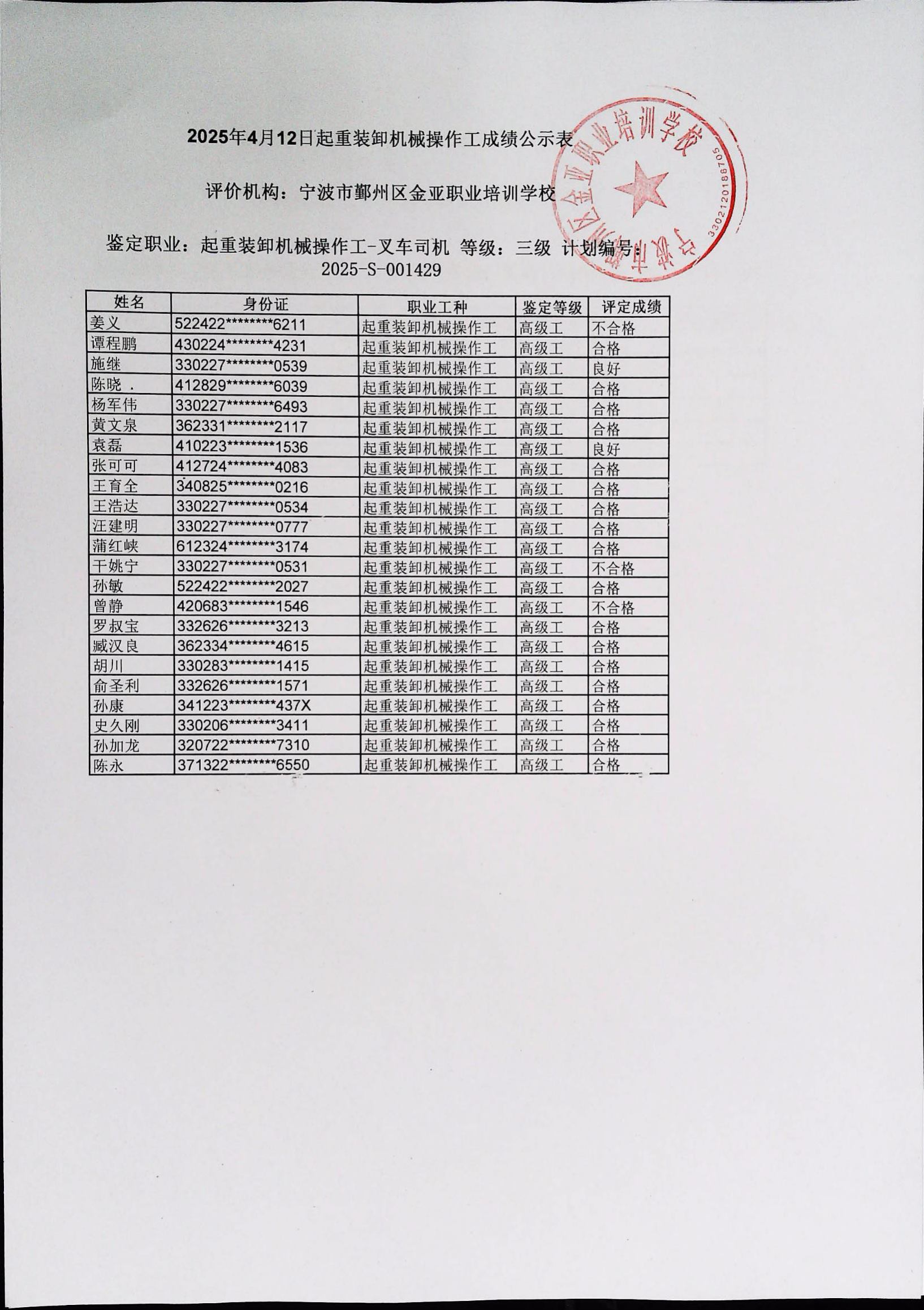 2025年4月12日叉车司机高级成绩公示