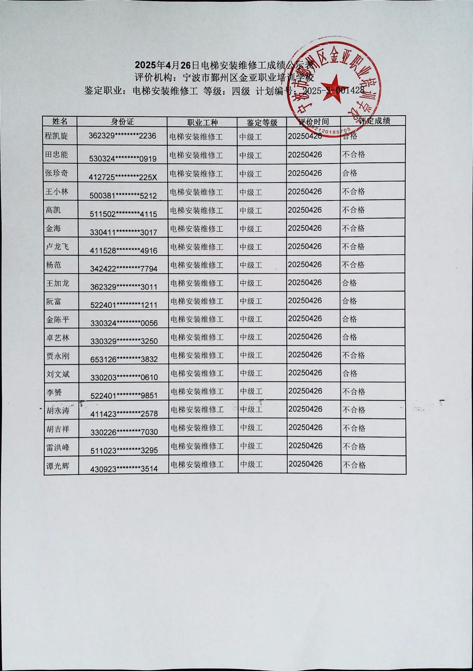 2025年4月26日电梯安装维修工中级成绩公示