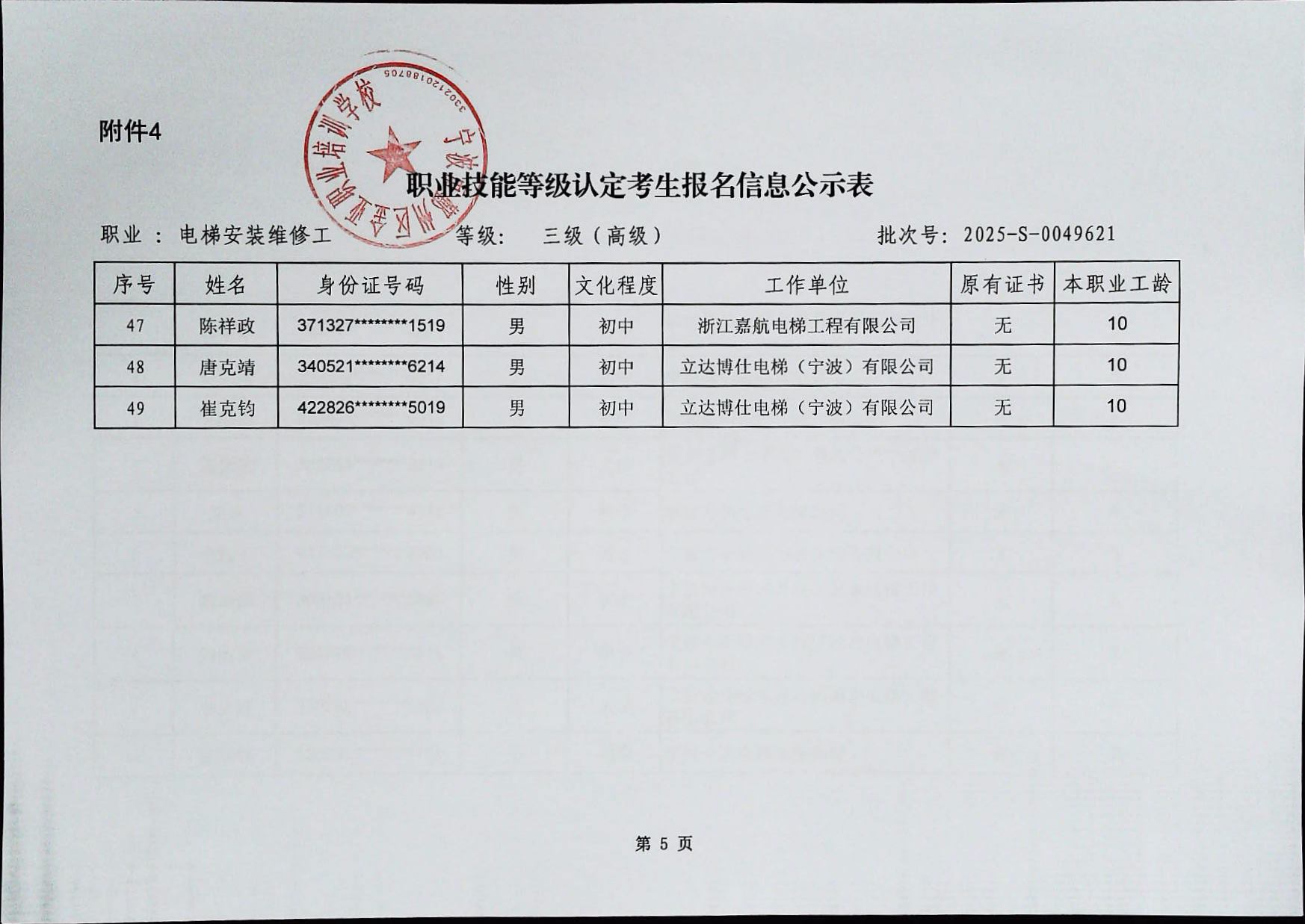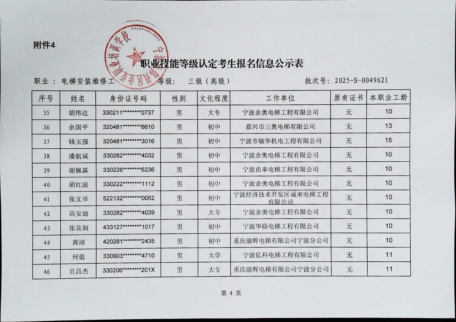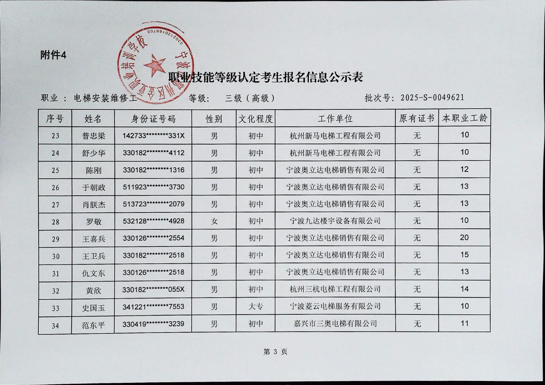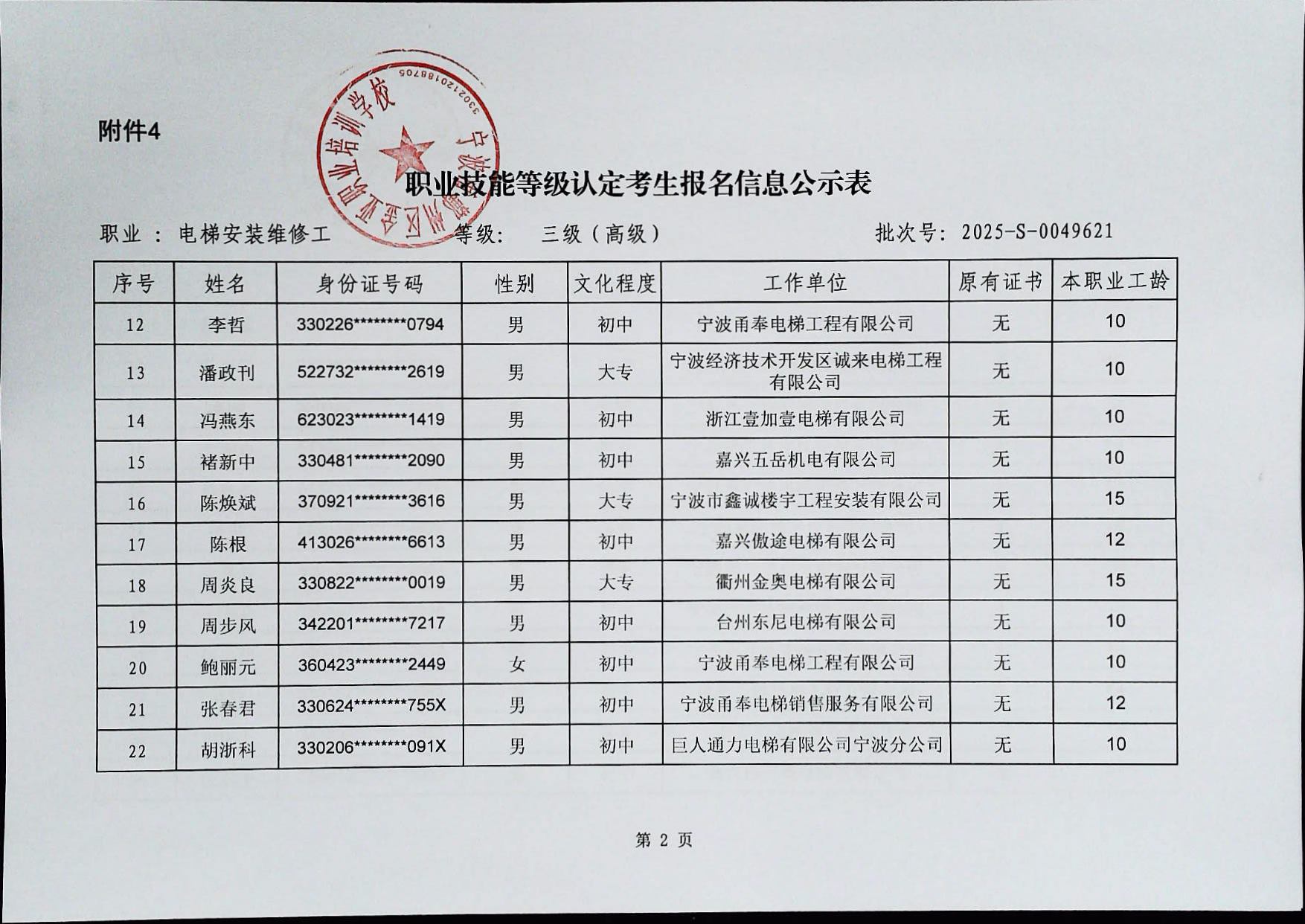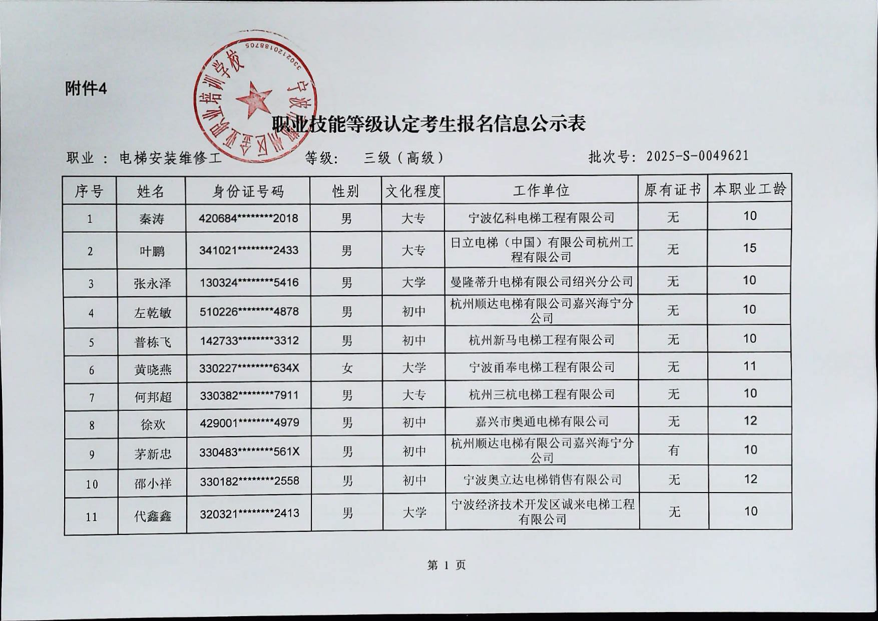 按照宁波市人社局鉴定中心公开电梯安装维修工等级认证考试公告规定的程序,把鄞州区人社局鉴定中心审核通过名单进行公示,现公示名单附件: