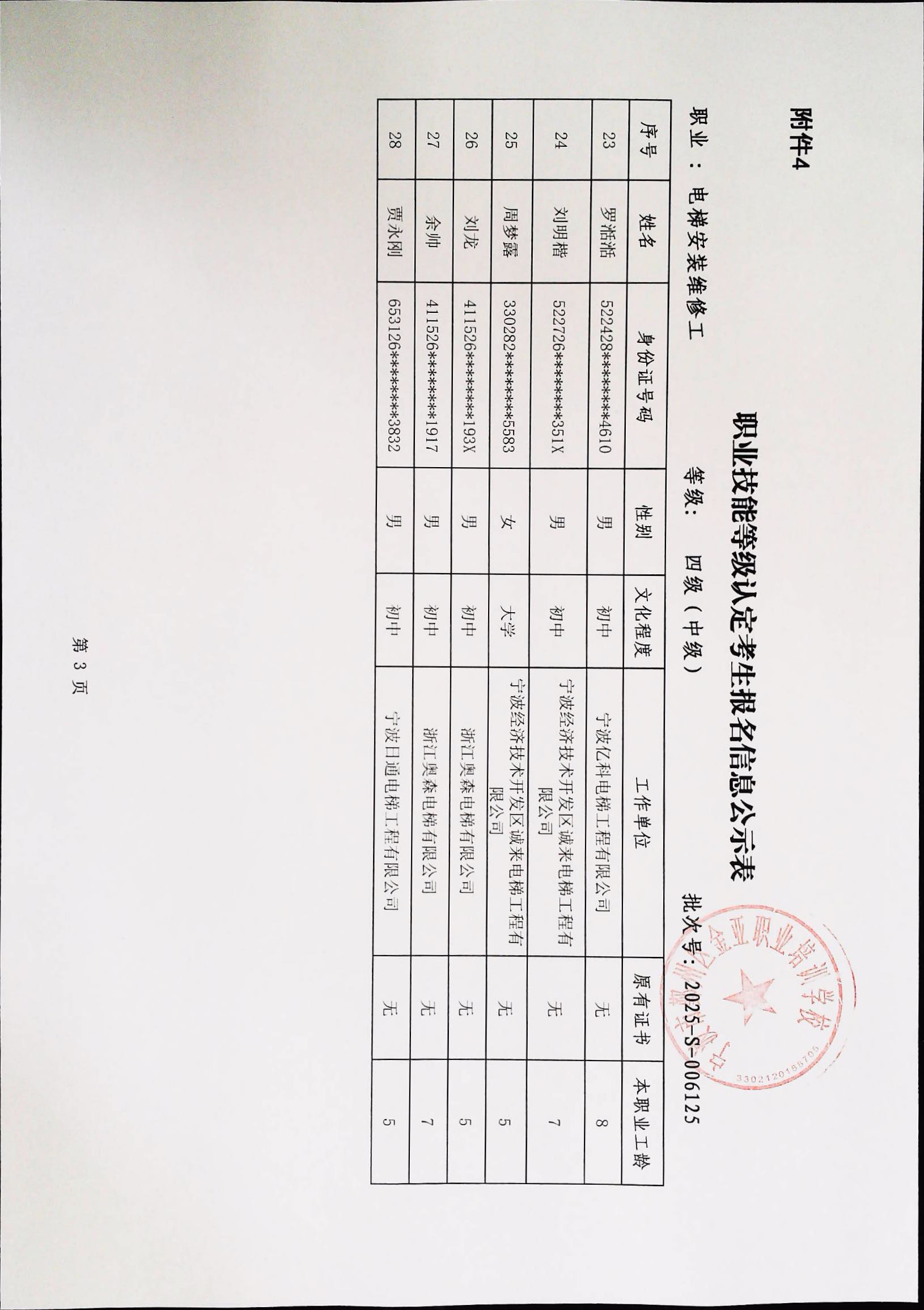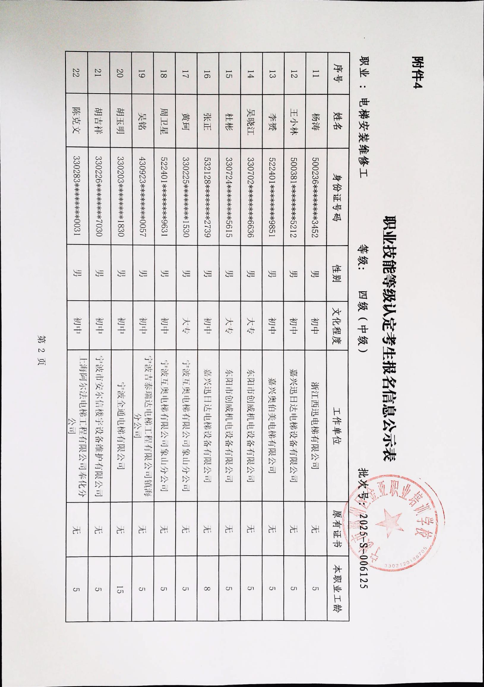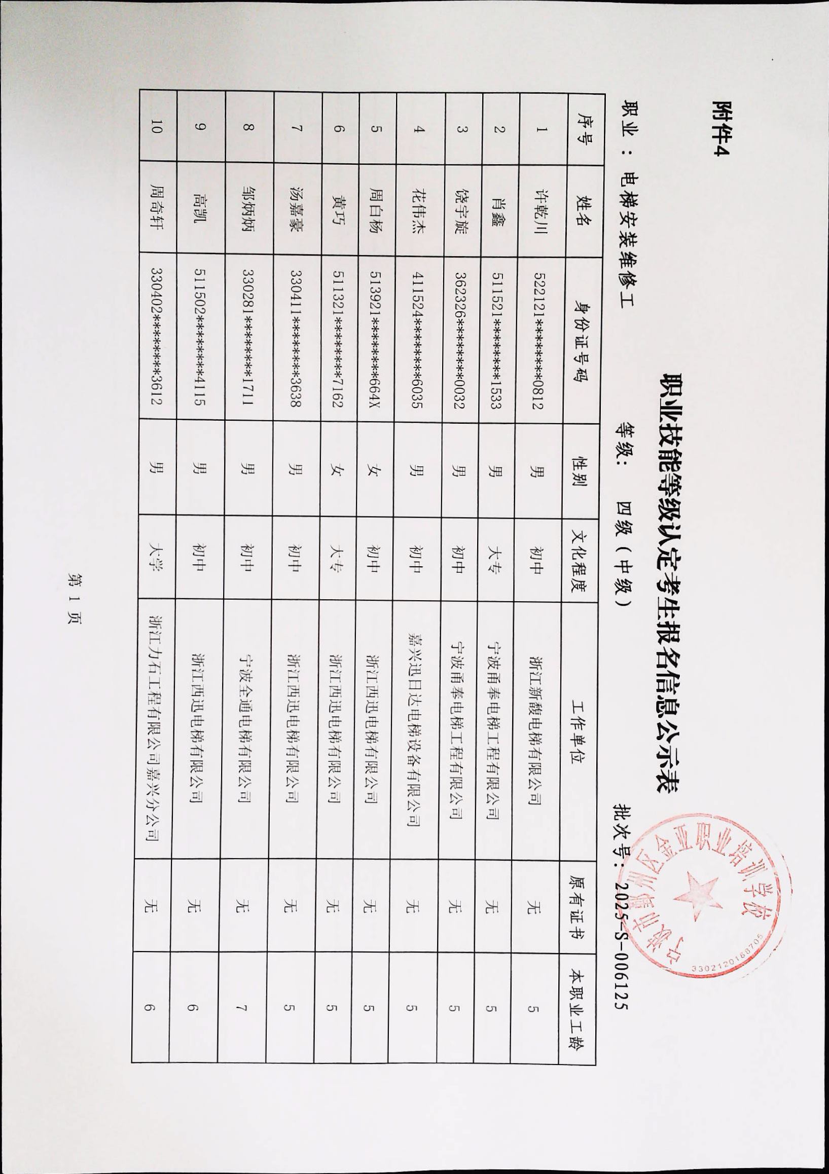 按照宁波市人社局鉴定中心公开电梯安装维修工等级认证考试公告规定的程序,把鄞州区人社局鉴定中心审核通过名单进行公示,现公示名单附件: