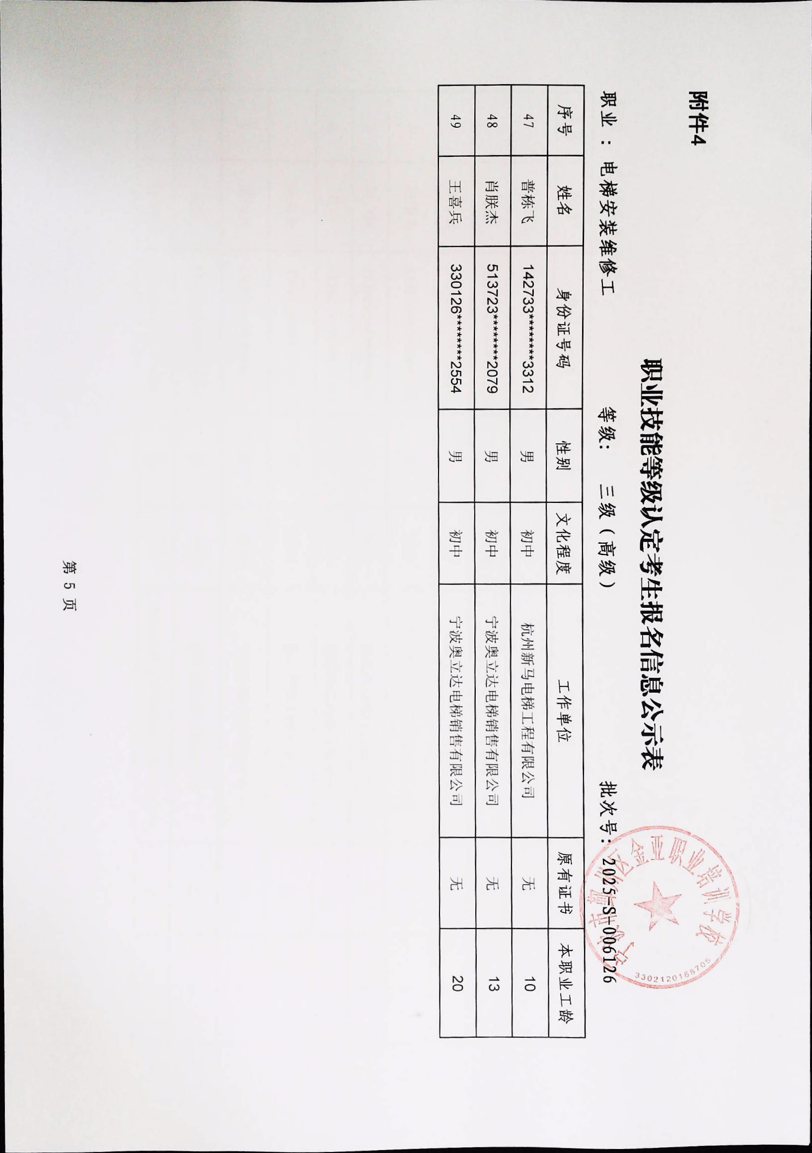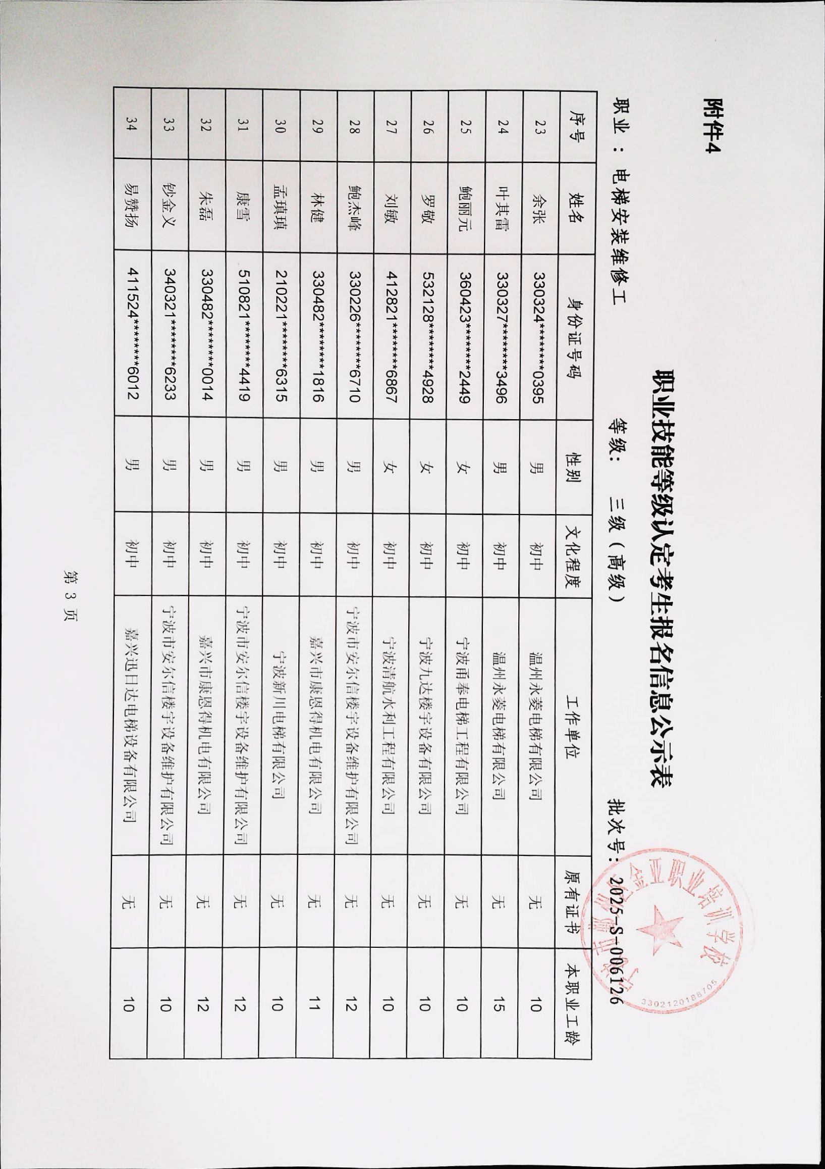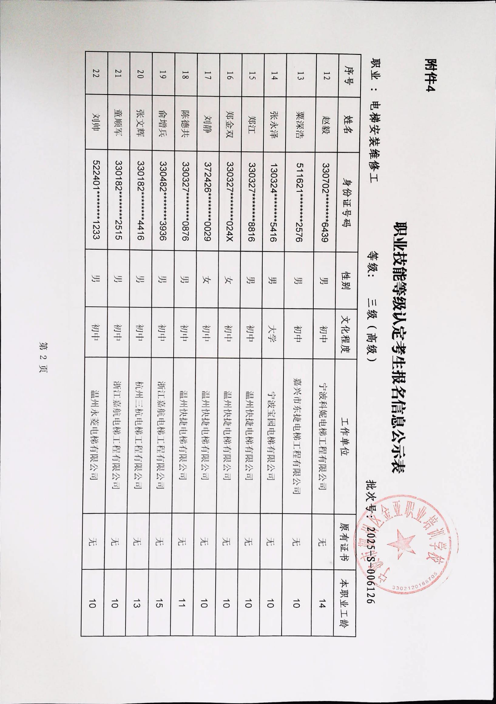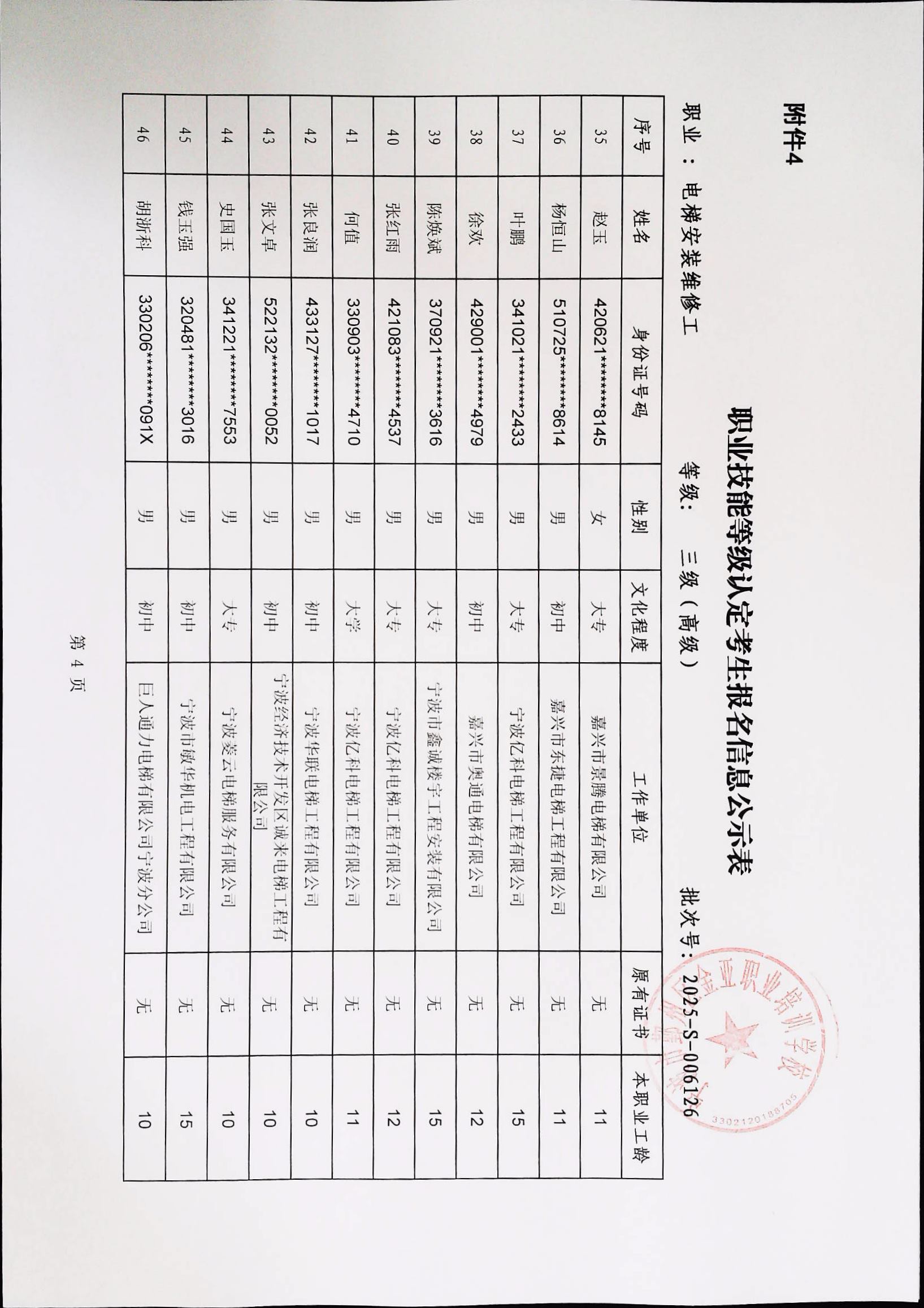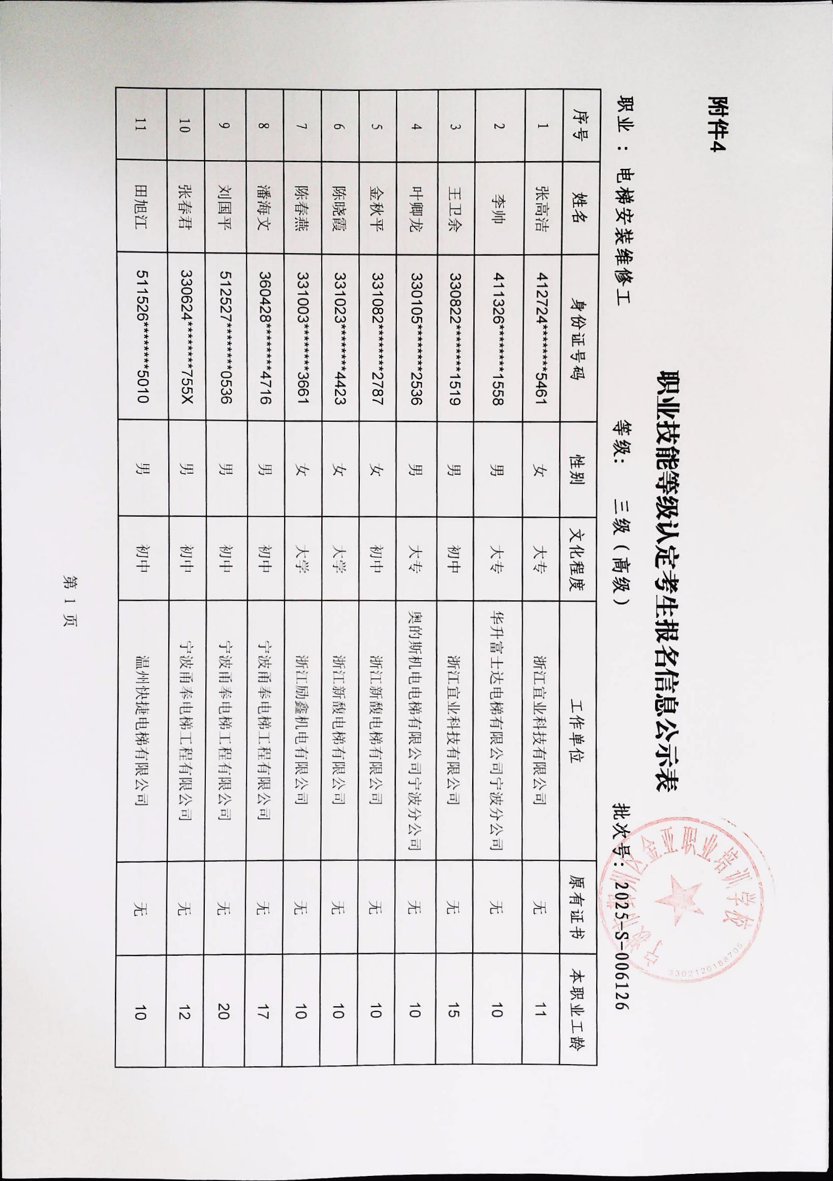 按照宁波市人社局鉴定中心公开电梯安装维修工等级认证考试公告规定的程序,把鄞州区人社局鉴定中心审核通过名单进行公示,现公示名单附件: