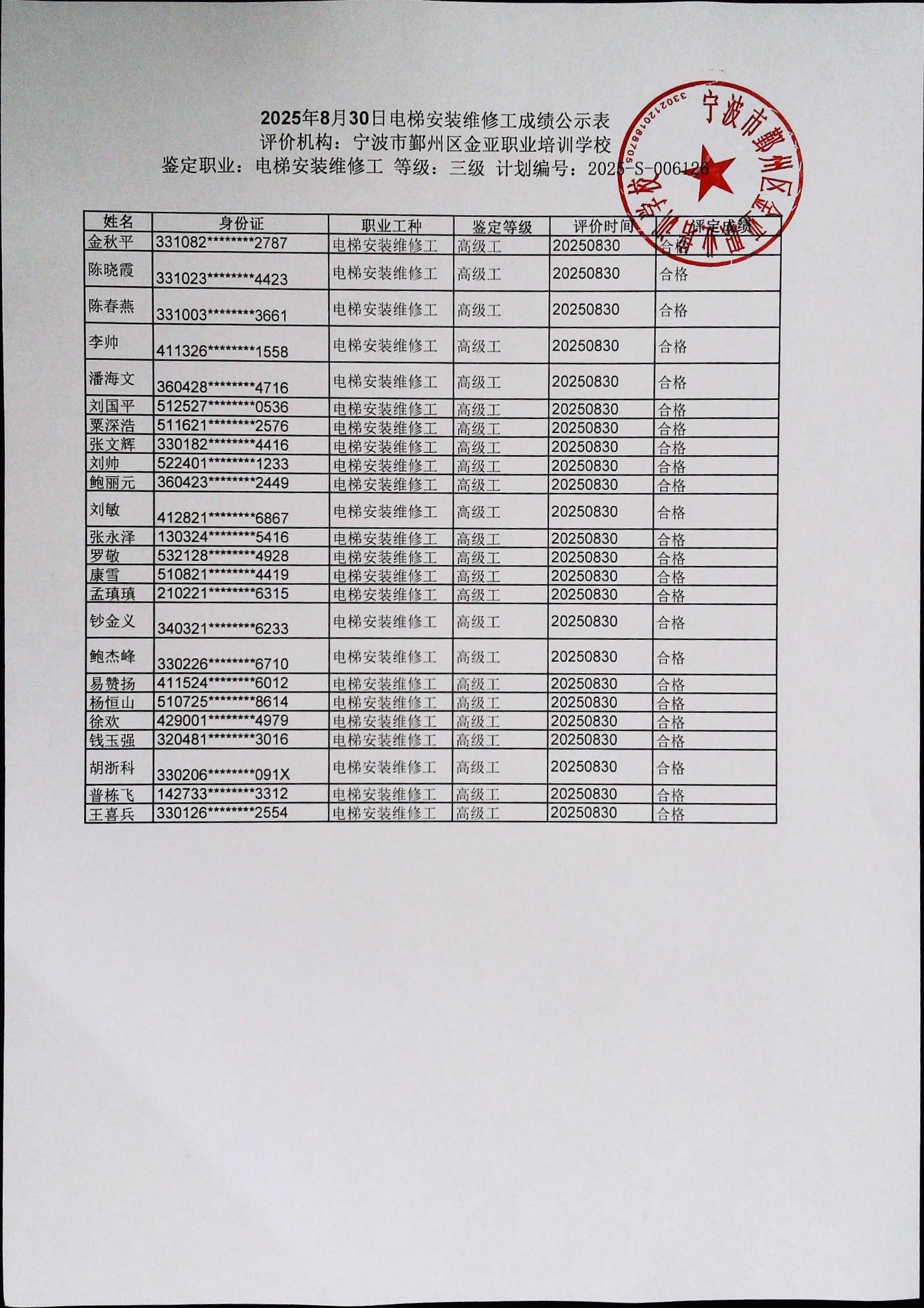 2025年8月30日电梯安装维修工高级成绩公示