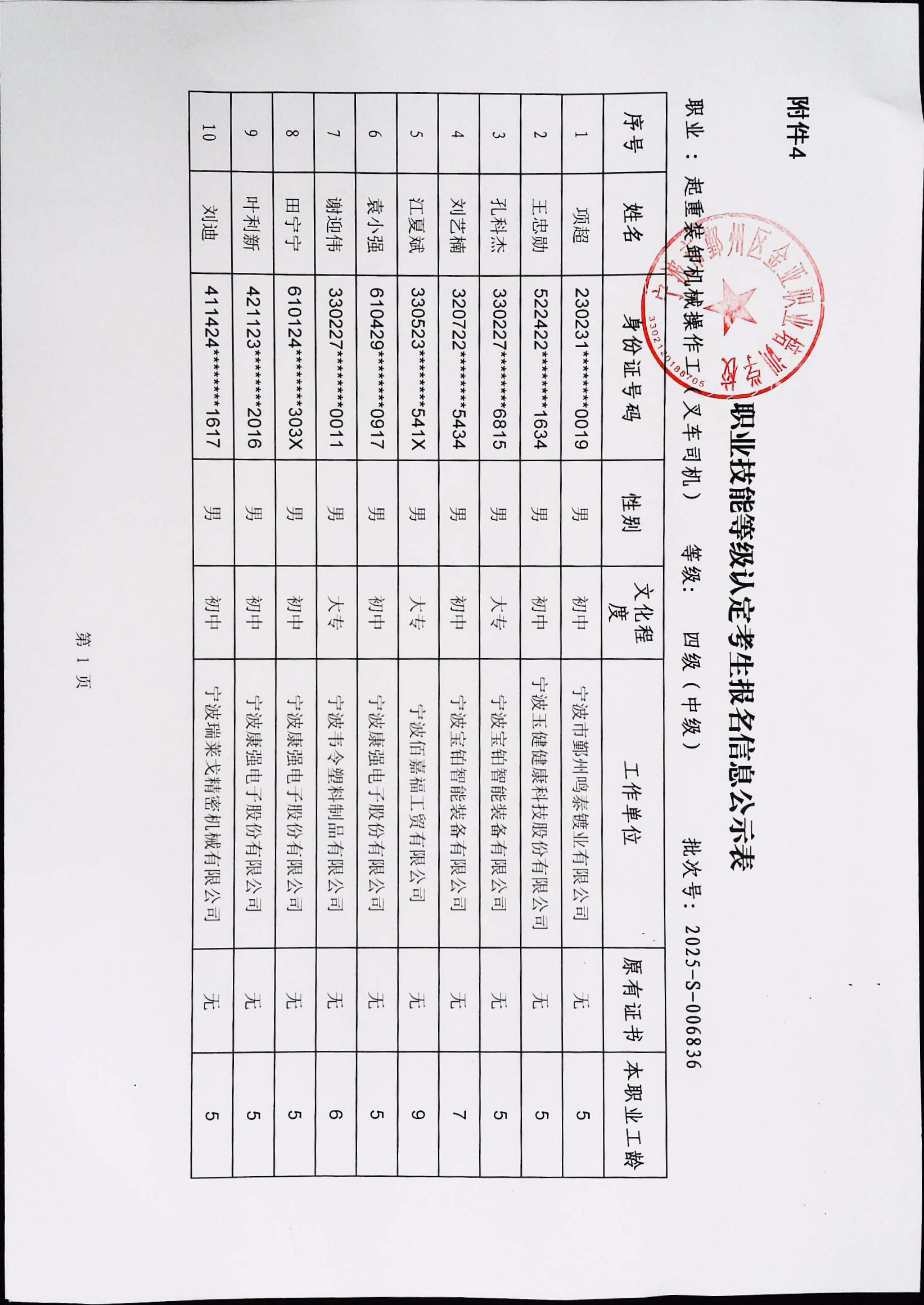 按照宁波市人社局鉴定中心公开叉车司机等级认证考试公告规定的程序,把鄞州区人社局鉴定中心审核通过名单进行公示,现公示名单附件: