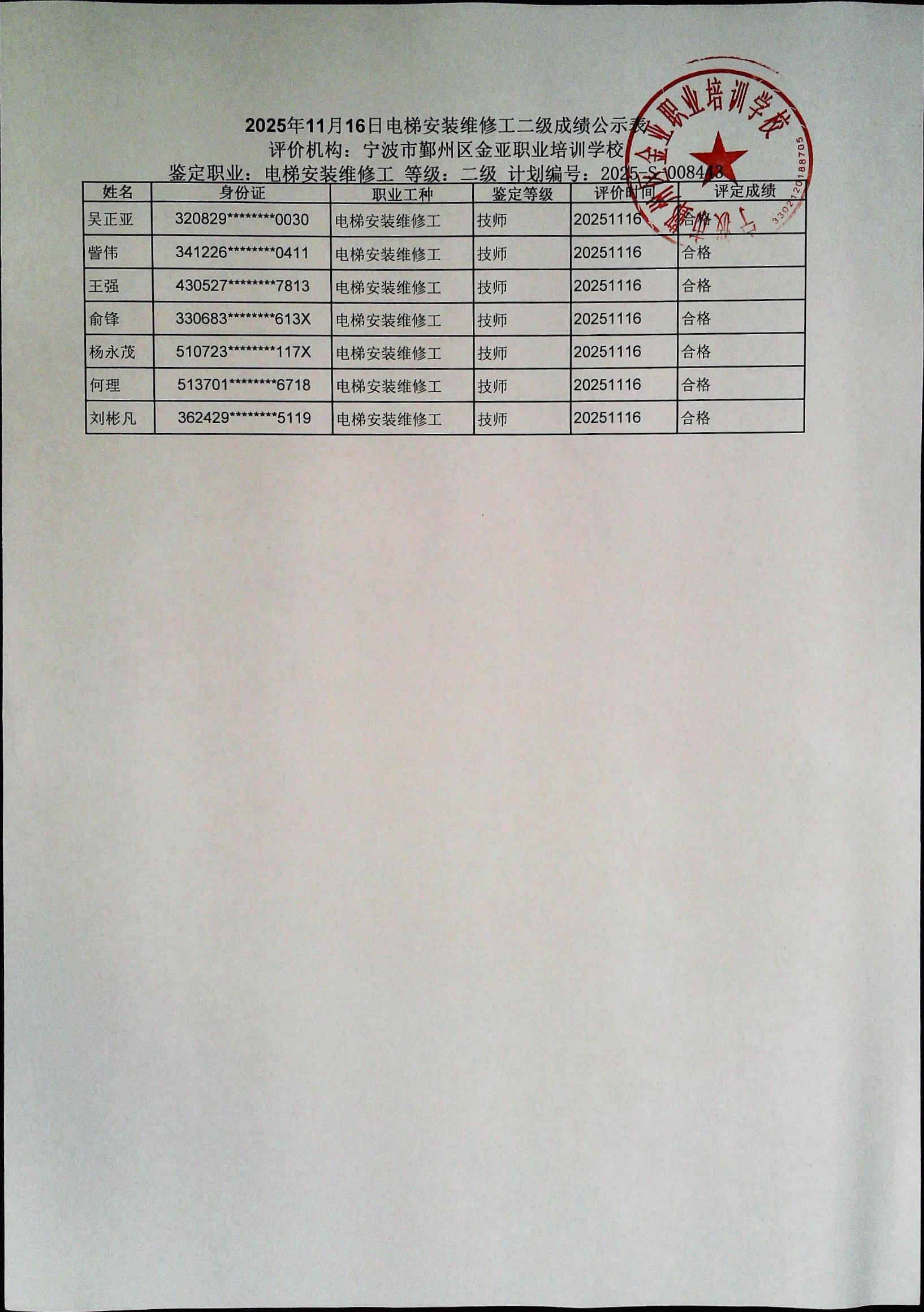 2025年11月16日电梯安装维修工二级技师成绩公示
