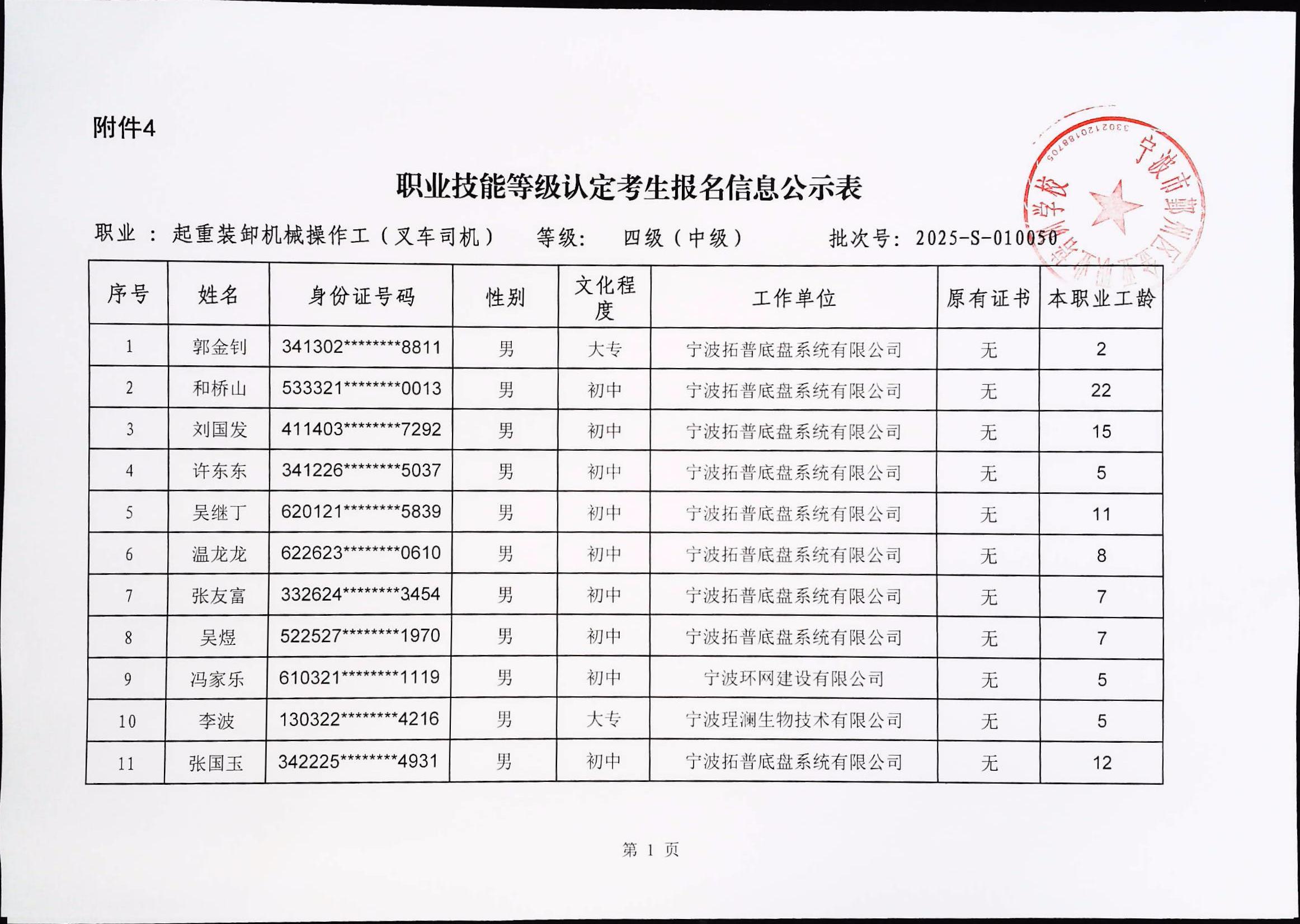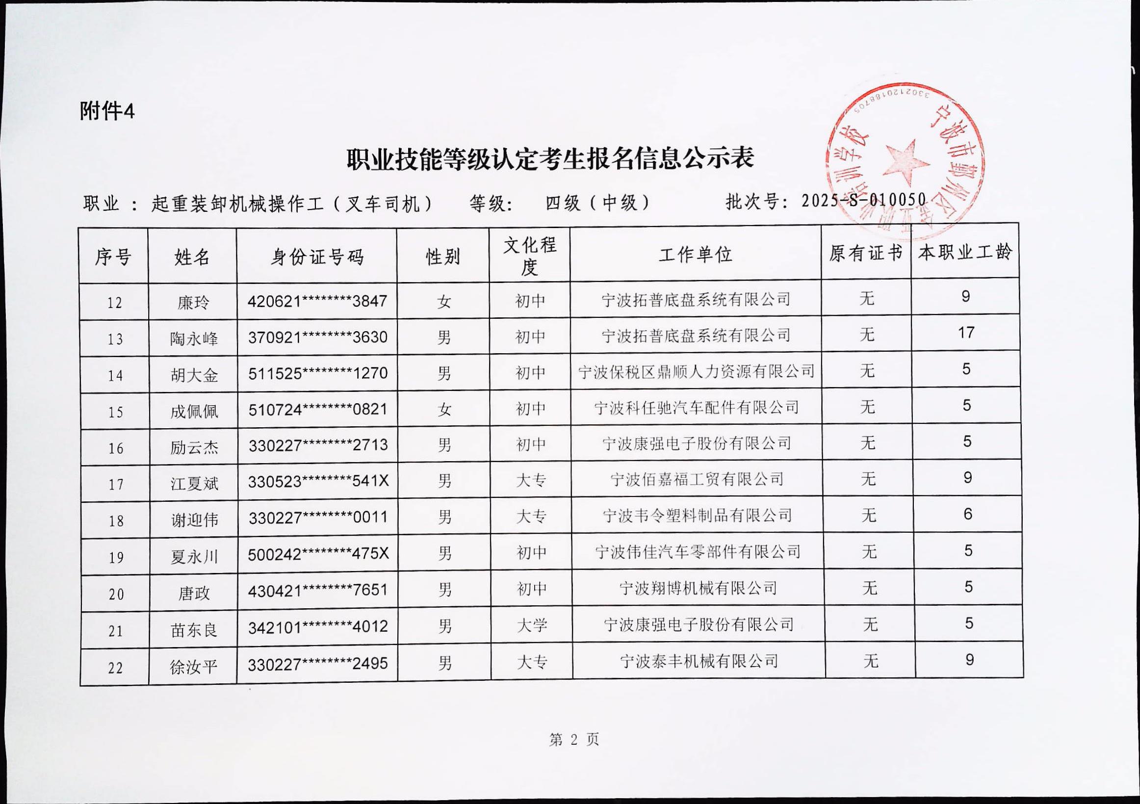 按照宁波市人社局鉴定中心公开叉车司机等级认证考试公告规定的程序,把鄞州区人社局鉴定中心审核通过名单进行公示,现公示名单附件: