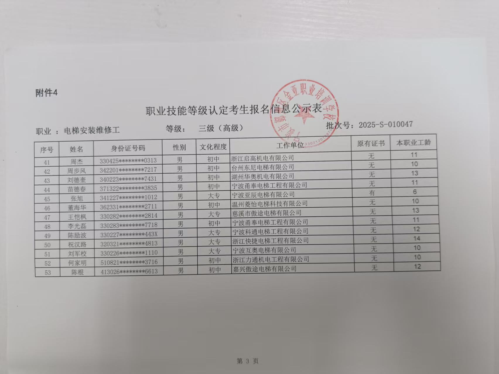 按照宁波市人社局鉴定中心公开电梯安装维修工等级认证考试公告规定的程序,把鄞州区人社局鉴定中心审核通过名单进行公示,现公示名单附件:
