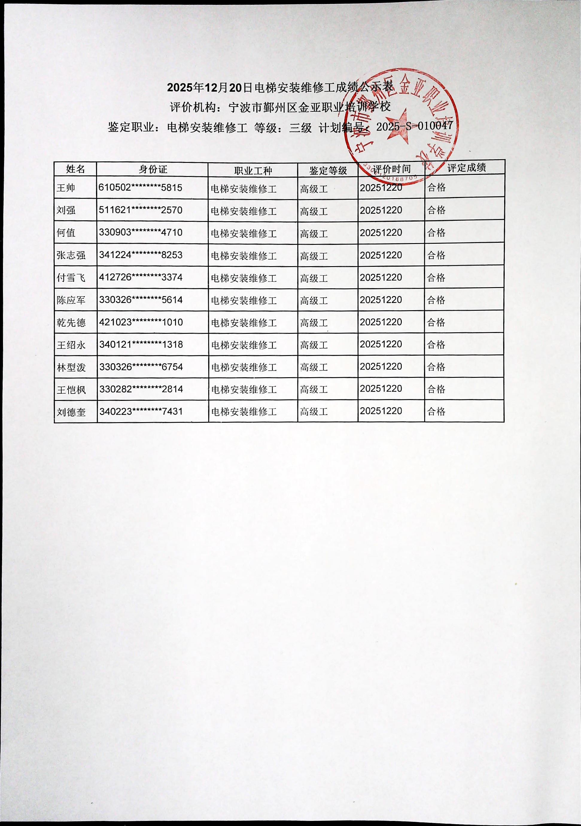 2025年12月20日电梯安装维修工高级成绩公示表